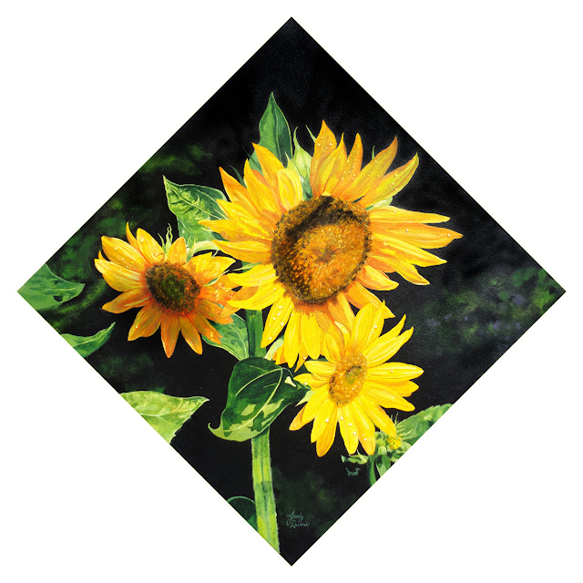 Sunflowers seem to make people smile, and these giant beauties actually planted themselves below our bird feeders! I captured this trio when the sun burst through after a light rain, so you can see the moisture still clinging to the petals. I actually painted “Sunshine On My Shoulder” to fit a frame I had bought at a yard sale; the frame was a perfect square so I thought it would be fun to find a subject that would fit well if hung on the diagonal, making a real attention-getter. The original is painted in acrylics on canvas measuring 24″ square and is for sale for $850 in the wide wood frame with natural and green tones.