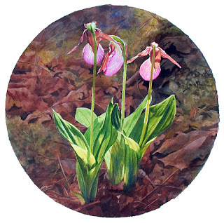 The forest around my house amazes me with the flowering spring wildflowers – every year it seems I discover new ones! Years ago we had hundreds of Pink Lady Slippers, which flower here at the beginning of May. Sadly, when we got a direct hit by a tornado in April 2011, the pine grove which supported these acid-loving plants was largely obliterated… the Lady Slippers which had carpeted the understory never came up again. In the years since then I’ve found only a handful of them still gracing spots where some pines remain, and I treasure the sight of these precious wonders every spring. I titled this grouping “Three Sisters” – thinking of myself and my two sisters, Anne and Jean. The circular format was a new twist for me, and I managed to finely (and carefully) tear the full sheet of watercolor paper along the big circle I drew, to make the edge deckled. The original was painted in acrylics, used transparently on watercolor paper, and is sold. I have open edition prints on paper as 8″ circles which sell for $100 framed and $15 unframed.