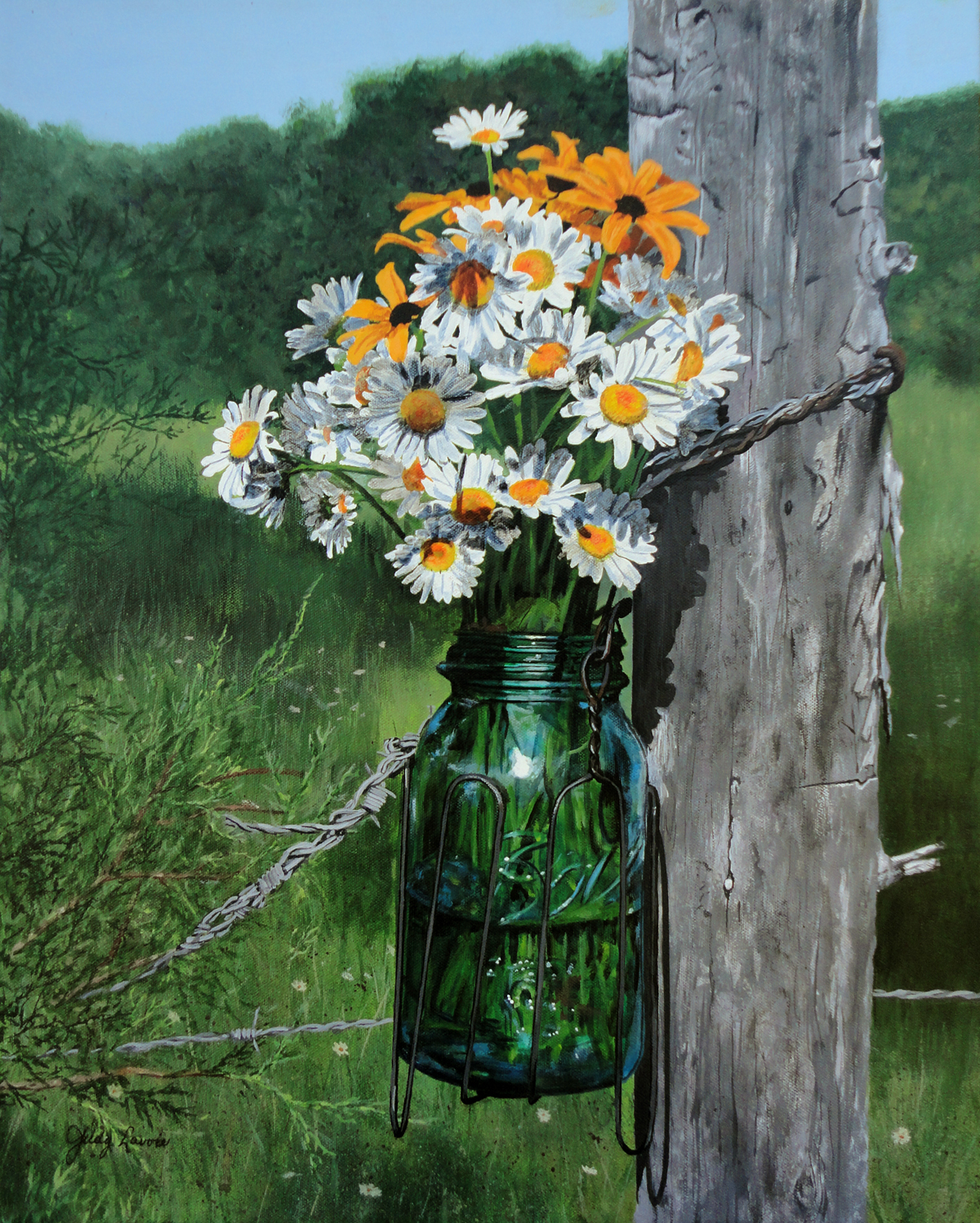 Wild daisies begin a long season of flowering in April here, and brown-eyed susans open a little later. This antique blue mason jar shows up in a few of my paintings, and seemed the perfect vase for a “Barnyard Bouquet,” hung by its old-time wire holder. I painted this in acrylics on canvas, and loved adding the weathered details to the old fencepost and twisted barbed wire. The original of this painting is sold, but I have 11″ x 14″ canvas giclee prints, $175 framed and $115 unframed.