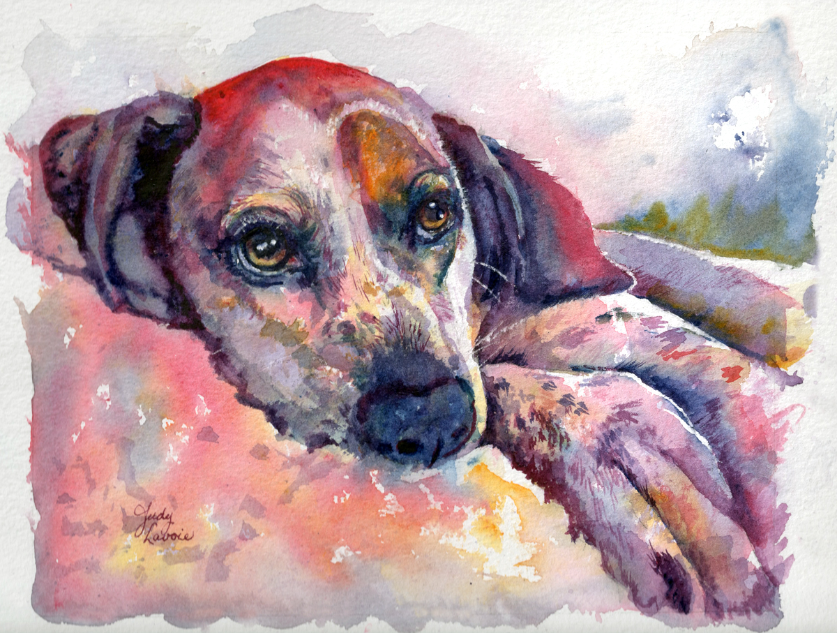 The subject of this painting is my four-year old dog Maggie Mae. She was truly the ‘puppy from hell’ but after age 2 became much more sweet, relaxed, loving, and under control. On her worst days we coined the phrase “‘…good thing she’s cute” – her expressions made it hard to be angry for long. We rescued her, so her heritage is unknown but best guess is coon hound mixed with beagle. Her big eyes are captivating and she is very photogenic.