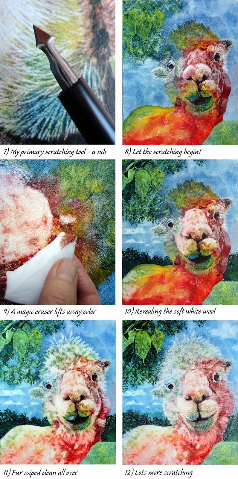 With my recent use of scratchboard, I knew this would be the ideal painting surface to depict the fabulous alpaca fur. My previous scratchboard paintings have mostly been done in a realistic style, so I decided it was time to introduce a new twist. I’ve gotten continuous positive feedback from my bright colorful paintings, and I felt such a palette would make this happy face even more fun and whimsical.