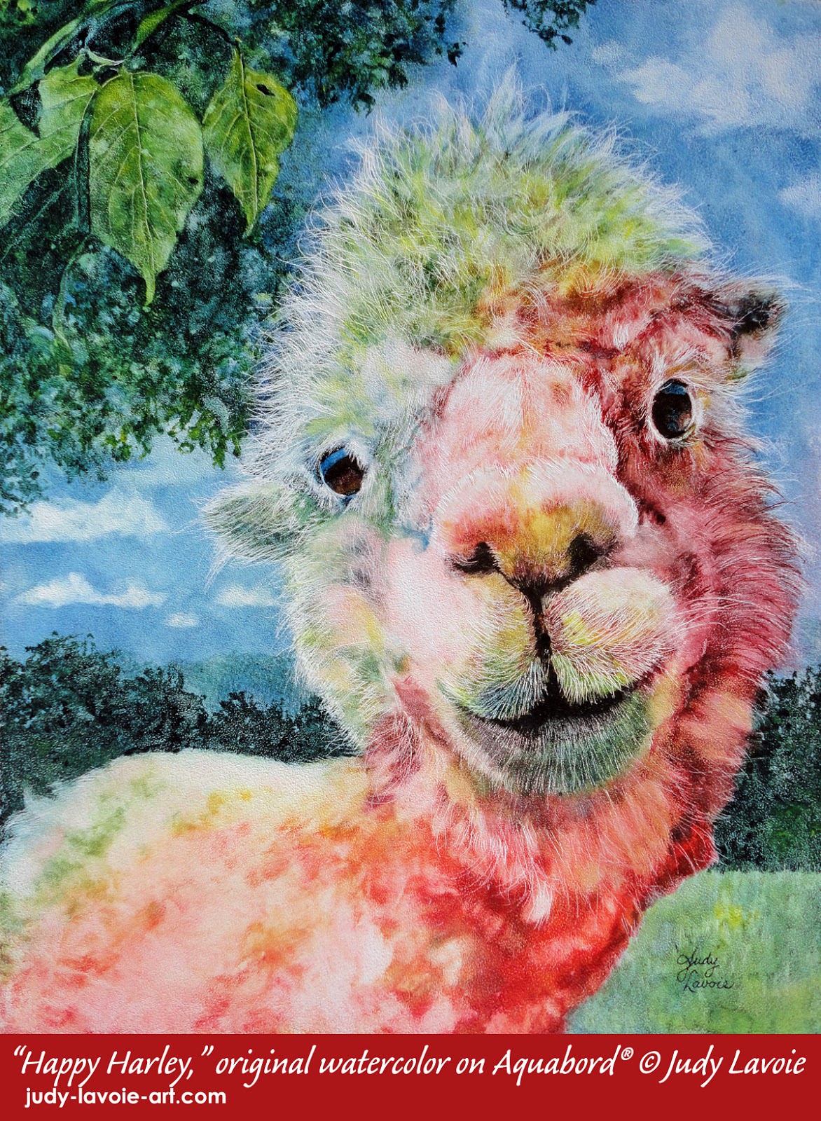 The first few people to see this painting have reacted with a chuckle, and that’s just what I aimed for. I’ve decided to use Happy Harley as the “poster child” for my upcoming solo show, so he’ll have a place of honor on display from April-June. (Details will be posted here soon.) I’ve christened this as my first alpaca painting, and I look forward to doing more… as soon as these other “art ideas” stop popping into my brain!