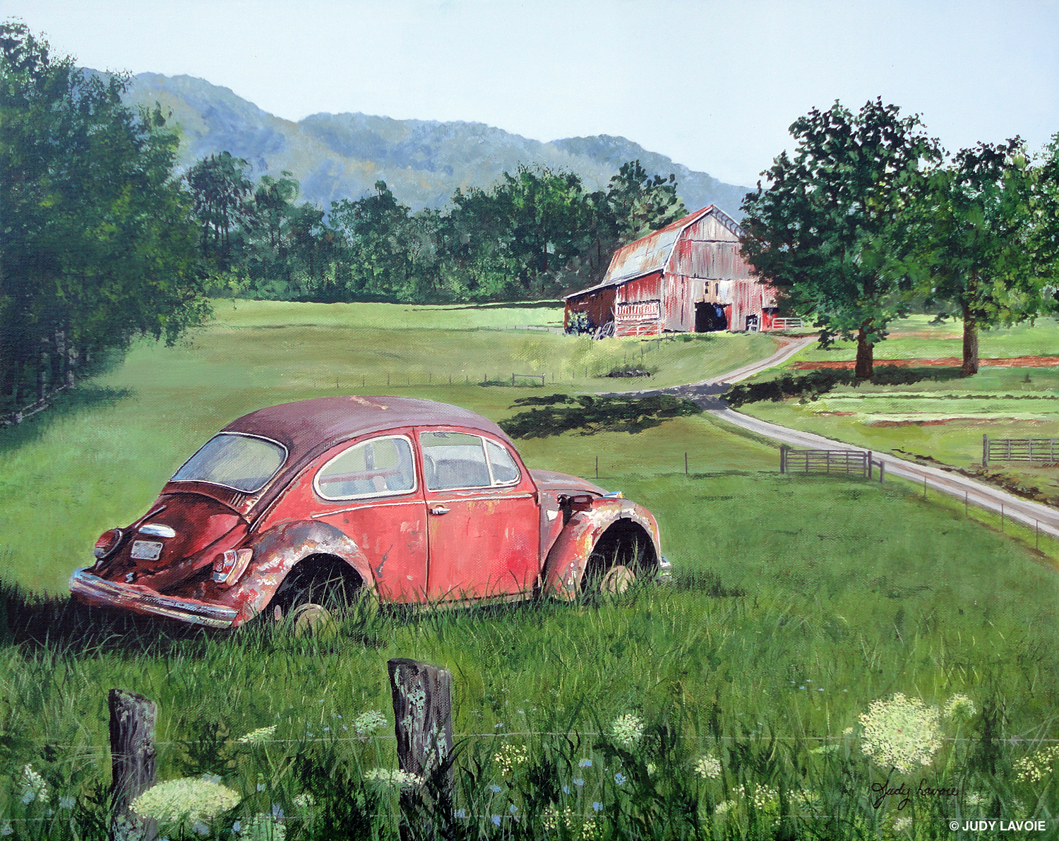 I did this painting in acrylics on a 20″ x 16″ canvas. My photos show how it progressed, with my initial pencil sketch guiding me along in the early stages. My greens are a bit brighter than in the Volkswagen reference photo, since I took those in October and I wanted this scene to depict June. Also, when I first painted the Queen Anne’s Lace flowers in the foreground, they were too white against the green grasses. I didn’t want to let them take emphasis away from the Volkswagen, so I glazed over the blossoms with transparent green and yellow tones to dull down the flowers, remembering the brightest brights belong on the focal point. I probably put more detail into the barn than I should have, since it’s off in the background, but I was having too much fun to stop!