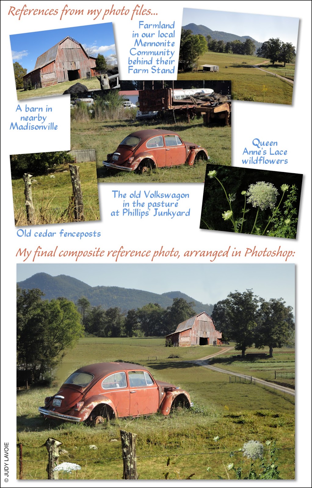 I’ve worked professionally with Photoshop software for decades, starting with version 1.0 (yes, I’m a graphic arts dinosaur), so I sometimes use this software when I arrange my reference photos. Of course, I wanted the Volkswagen to be my focal point, using the other elements to lead the viewer’s eye through the painting. As a rule of thumb, you shouldn’t put the focal point smack in the center of your painting – it’s too boring. You can see how I arranged and sized the different elements, putting the vehicle left and below the center. You can almost zig-zag from the top left, as the mountain slopes lead down to the barn, the tree shadows bring you back to the left, and your eyes land on the car. Using Photoshop, I can easily change the sizes of the various components and move them around until there’s a good balance and a pleasing composition. The composite image I create can be rough, since the photo is not my finished product. If the black background of the Queen Anne’s Lace still shows around the flowers, or the grass around the car doesn’t match the grass of the farm setting, no problem. You can see how I combined the various reference photos into my final composite in the collage of photos above.