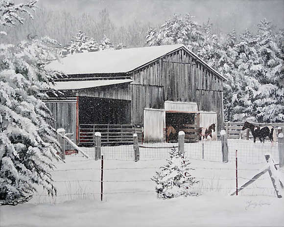 I painted “Let It Snow” as a barnyard scene in the midst of a snow storm. The horses are shown in and out of the barn, perhaps disturbed by the weather. The snow is wet and heavy, bearing down on the branches of the evergreens. The scene is grey and chilly.
