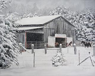 Paintings of snowy landscapes are one of my favorite subjects. We don’t get a lot of snow where I live in SE Tennessee, except in the higher mountains we view from our front porch. When there is any accumulation near the house, I can hardly wait to get outside with my camera. This month’s featured artwork combines my love of snow with another favorite painting subject of mine, barns. The two barns shown in this artwork are on my neighbor’s property, so they are very familiar and dear to me.