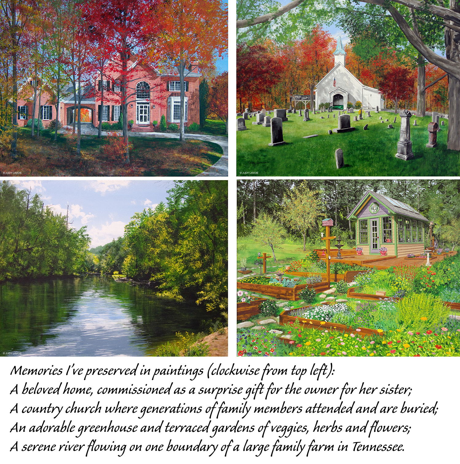 A notable home I painted was the farmhouse where sweet Miss Shirley had grown up. Her parents were deceased and the home was no longer lived in, but family members often returned for gatherings and the house came alive again. I had actually visited the farm a few years before Shirley asked me to do a painting of the farmhouse, so I had a good feeling about all the happy times attached to it. When I do a house portrait, it is fun to add special personal details, like the owner’s dog or a tree with initials carved. Shirley provided me with photographs and specifics about the flowers she’d like to see growing, the old building behind the house, the porch chairs, and other details. Shirley and her husband Frank have built their own retirement home on another part of the farmland and hung my painting in a place of honor over their fireplace mantle. Sadly, the farmhouse painting became even more precious a few years later, when the building burned to the ground from an electrical fire, fortunately with no one present.