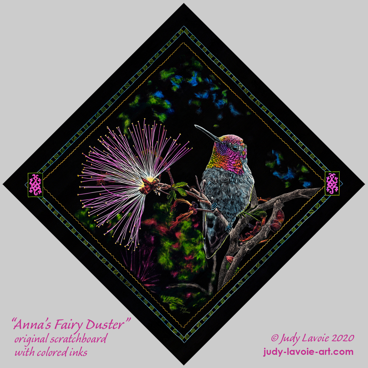 As in much of my work, I wanted to use colors bright and bold. I chose to depict a male Anna’s Hummingbird, one of the most frequently seen species seen in the Sonora Desert, whose neck feathers varied from bright magenta to orange to yellow. I’d incorporate the same colors into the border design, without letting it become overpowering. These colors would add vibrancy to the artwork.