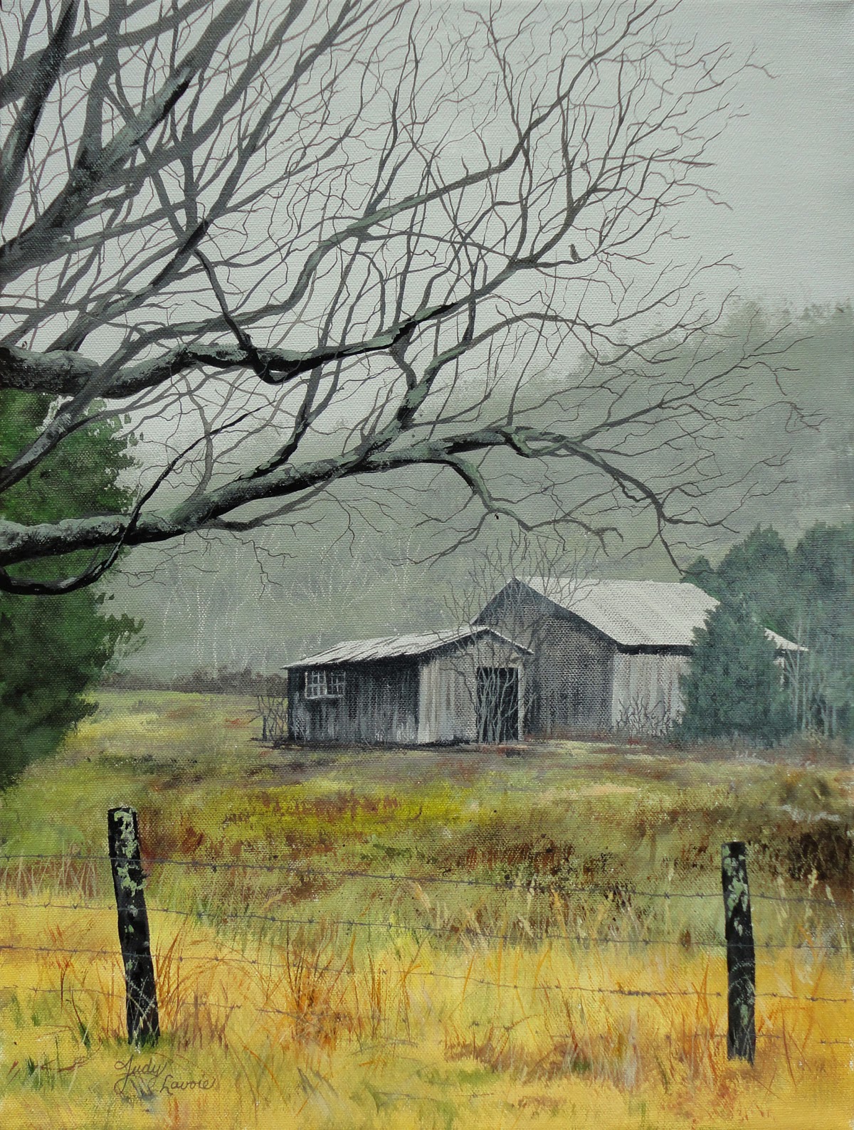 In this barn scene, I wanted to capture the three-dimensionality of the landscape. Distant hills, thickly covered with trees, are subdued by the moisture in the air, so I’ve painted them in greyed colors not much different from the sky. The middle ground of old farm buildings and their surroundings appear a bit more in focus, but the colors are still dulled. A close cedar tree on the left forms another plane, as we move forward in the scene. The foreground is dominated by the bare tree branches, warm tones in the grasses, and old barbed wire fencing. Close objects visually come forward when painted with bolder hues, more contrasts, and finer details than those of the distant objects.