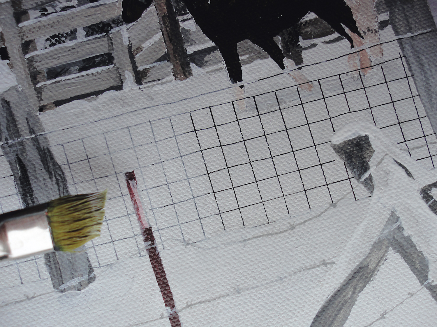 The monochrome tones of this painting are quite a departure from my usual use of color, bright lighting and shadows. I wanted to do something different from the snowy barn in sunshine that I most recently completed. And I admit being influenced to try a primarily gray painting after seeing the oil paintings of an artist I met on Christmas Eve, Phillip Anthony, who does exquisite landscapes entirely in black, white and grays.
