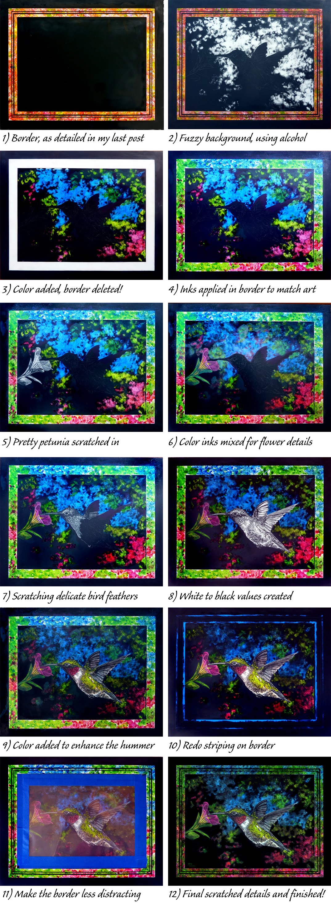 The scratching of the hummingbird began next, with strokes in the direction of the feathers. Again, I’ve used the scratching to create a range of values, from white to black and many shades in between. To color his body, I used diluted black, diluted blue/green, a reddish pink, spots of beige, and mixtures of yellow/greens. The areas left pure white help draw the viewer’s eye to the hummingbird as the focal point.