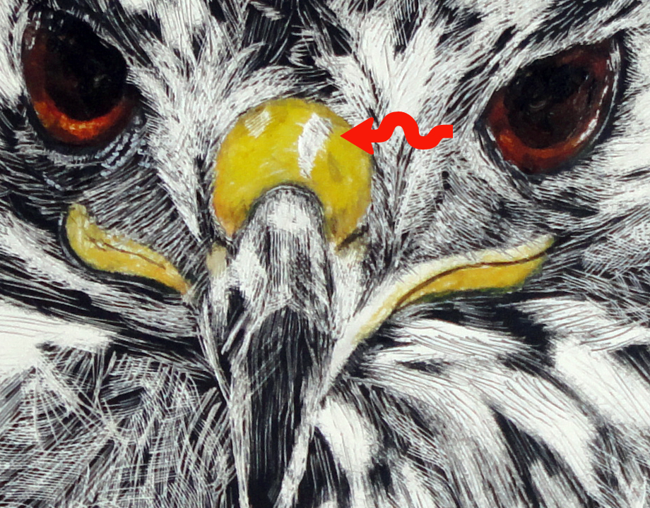 close photo of dirtied scratch area on hawk's beak1) Don’t scratch to uncover big areas (like over 1/8″) which you want to stay pure white until you are finished scratching black away elsewhere. The scratches in such areas can collect fine black dust and this can be tough to remove. In my anxious attempt to depict the highlight on the yellow part of Scarlett’s beak at the start of my painting, I faced this problem. After the scratches filled with black, I tried to scratch deeper to get back to pure white and was unsuccessful. I was afraid to scratch any deeper. I tried wiping away the black residue with isopropyl alcohol, but that didn’t work. Ultimately, I painted the small area over with gesso as one of my final steps to resolve this problem to recreate a pure white area.