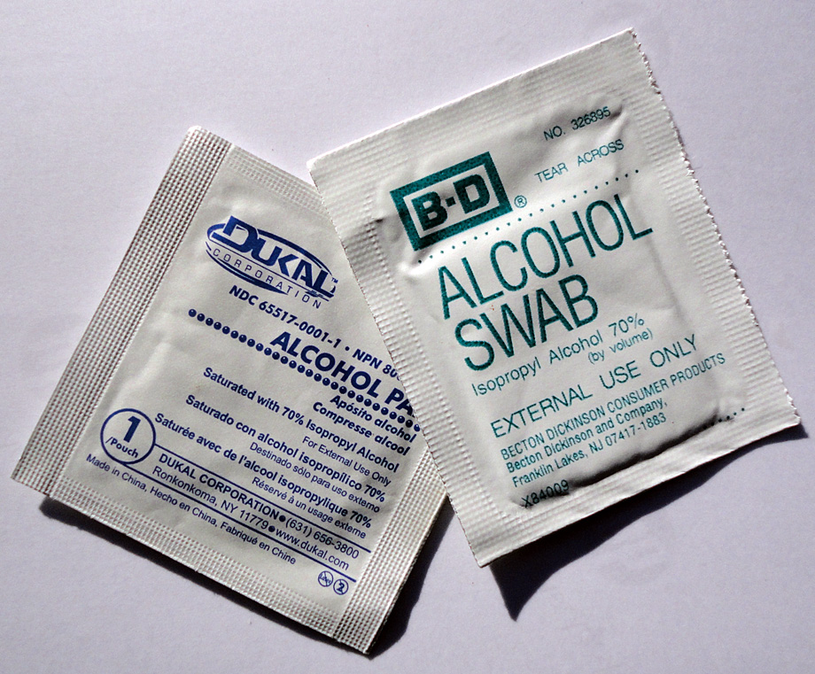 (B) For a large area, individually foil-packaged pads of isopropyl alcohol are handy. Some are more saturated and thicker than others; I like the “Dukal” brand since it is a small thin pad and just slightly damp. As an alternative, fold a little square of tissue and dab it in alcohol to wipe with.