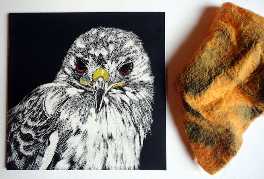 1) Don’t scratch to uncover big areas (like over 1/8″) which you want to stay pure white until you are finished scratching black away elsewhere. The scratches in such areas can collect fine black dust and this can be tough to remove. In my anxious attempt to depict the highlight on the yellow part of Scarlett’s beak at the start of my painting, I faced this problem. After the scratches filled with black, I tried to scratch deeper to get back to pure white and was unsuccessful. I was afraid to scratch any deeper. I tried wiping away the black residue with isopropyl alcohol, but that didn’t work. Ultimately, I painted the small area over with gesso as one of my final steps to resolve this problem to recreate a pure white area.