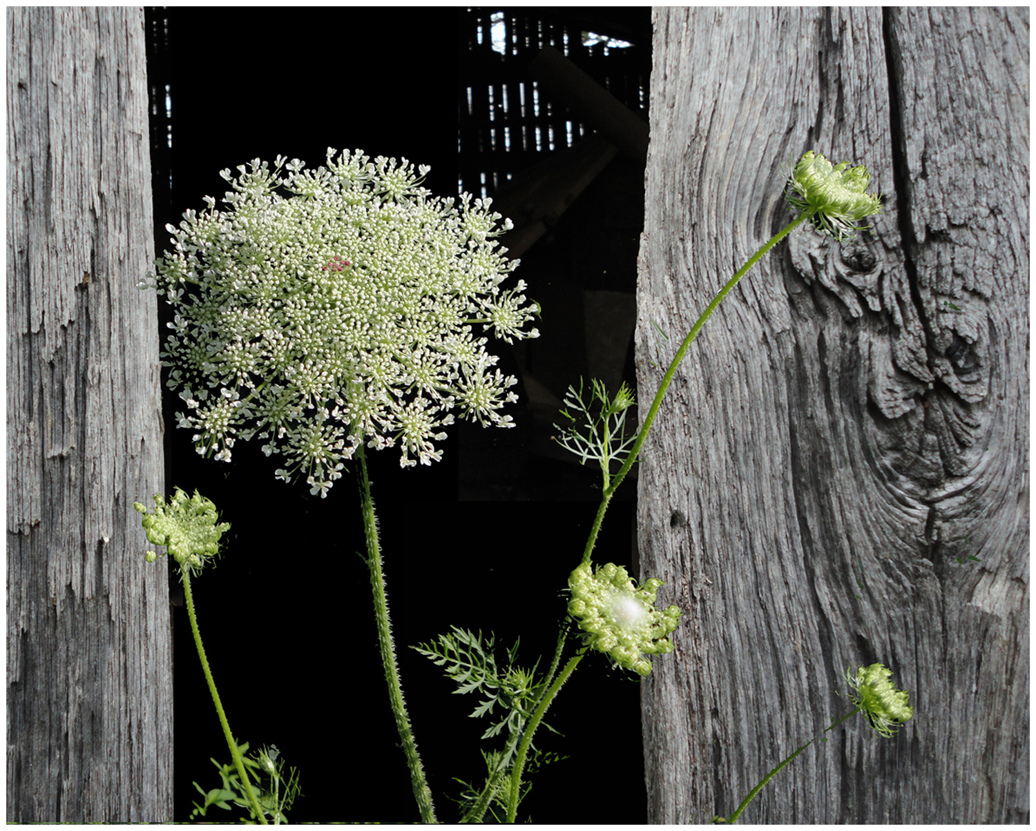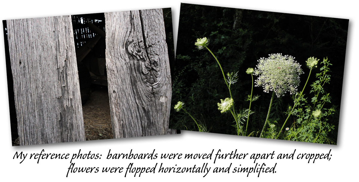 The white and light green shades of these flowers and foliage contrast well with a black background, so I chose them as my wildflower subject once again. I wanted to depict the flowers in an appropriate setting, to add interest without distracting from my focal point of one fully opened bloom. Many old nearby barns have broken and missing boards, so I kept my eyes peeled as I travelled until I spotted an ideal reference to photograph… a barn with deeply textured grey vertical boards, with a space of darkness between two boards where an old board was missing. The barn was close to the road, so I hopped out of the car and took several reference photos, at eye-level and holding my camera perfectly parallel with the section of the barn I envisioned would work best in my painting.