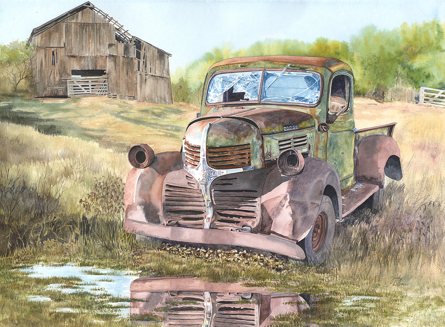 Where I position my focal point within the scene is my first design decision. A landscape is composed with layers of depth, from the most distance to the closest elements. For example, the sky would be the furthest point away, with distant hills or mountains or woods next, closer buildings or trees in front of those, and foreground elements in the front. This is often the order I follow when painting a landscape with acrylic paints – painting the parts furthest back first, and overlapping until I reach the front. My tendency is to position the focal point closer to the foreground than to the background, but back far enough for me to have other elements in front of it. This might be as simple as putting the puddle in front of the truck in “Out To Pasture.”