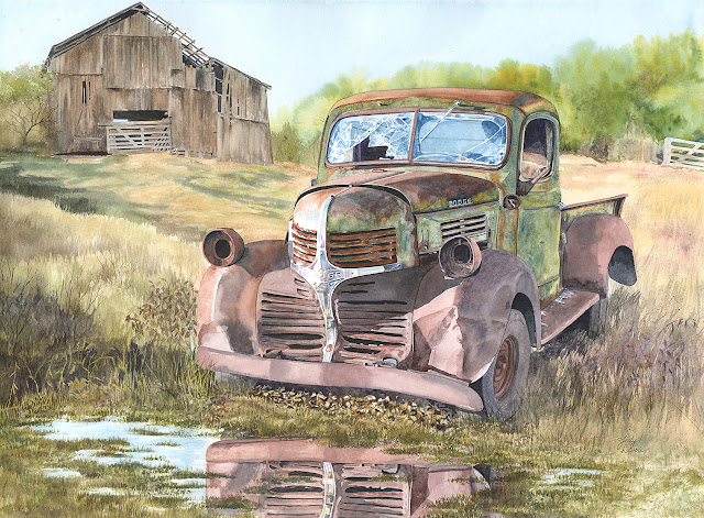 I often create landscapes with one main focal point, like a building or an old vehicle. Then my challenge is to give the focal point a “setting.” This focal point somewhat dictates the other elements I choose to incorporate into the scene, since I want it to look plausible and realistic. The old truck in “Out To Pasture” (shown above) seemed suitably positioned with an old barn in the background. If I’m working from a photo I took of my focal point when it was partly in shadow and partly in the sun, I want to make the whole scene looks sunny, and choose other elements which are lit by the sun from the same direction. Sounds kind of obvious, but this takes some extra effort. I also want to select other elements to add to the scene that logically go with my subject – an old farm tractor under a palm tree on a city street would not suit me!