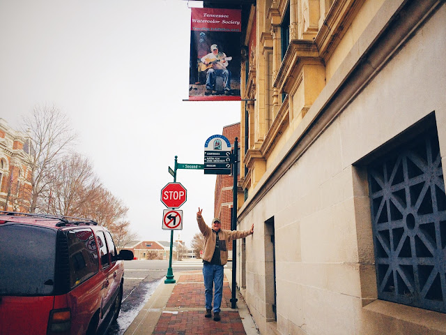 My friend Mike, the subject in my painting and a native of Nashville, visited the exhibit with his wife Debra and sent me this great photo of himself with the banner.