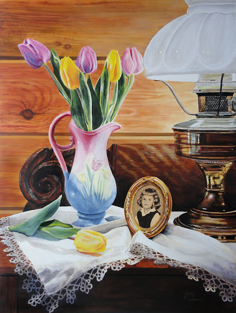 Fast forward to 2017. Usually a painting comes before the framing, but the opposite happened in this case. I had bought a lovely antique tiger oak frame which matched a lot of our furniture. I wanted to paint something to fit the frame and hang it in my house. With these thoughts circling around my brain, the idea for my new painting came together when I saw colorful tulips for sale last spring. It had been 20 years since I painted “Now and Then,” and 55 years since the crayon drawing, so it would be interesting to do it again, in acrylics this time. So I bought a pot of yellow and a pot of pink tulips and gathered some props to set up a still-life. As the newest painting shows, I arranged the tulips and set the vase of flowers on top of an oak bookcase which has a decorative panel on the back. I laid one yellow tulip at the foot of the vase. A little oval frame in this grouping features a photo of me at age 7. I used an old brass table lamp to cast some sidelight and positioned everything on an antique cotton mantle cloth, one of many pieces of needlework with tatted lace in my collection – my grandmother taught me to tat long long ago. To make an interesting composition, I bunched up the fabric and let it fall unevenly over the end of the furniture, instead of laying it flat and straight.