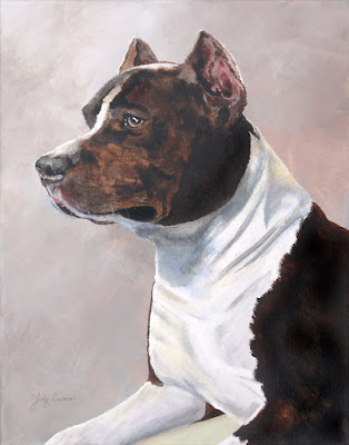 I simplified the background for my painting, blending some warm grey mid-range tones which would work well against Tyson’s white and brown fur. The photo of Tyson had good shadows in his upper body which helped me define his muscle form. I did the best I could at sharpening up his eye and detailing the nose, but had to settle for a bit less detail than I usually incorporate in my paintings.