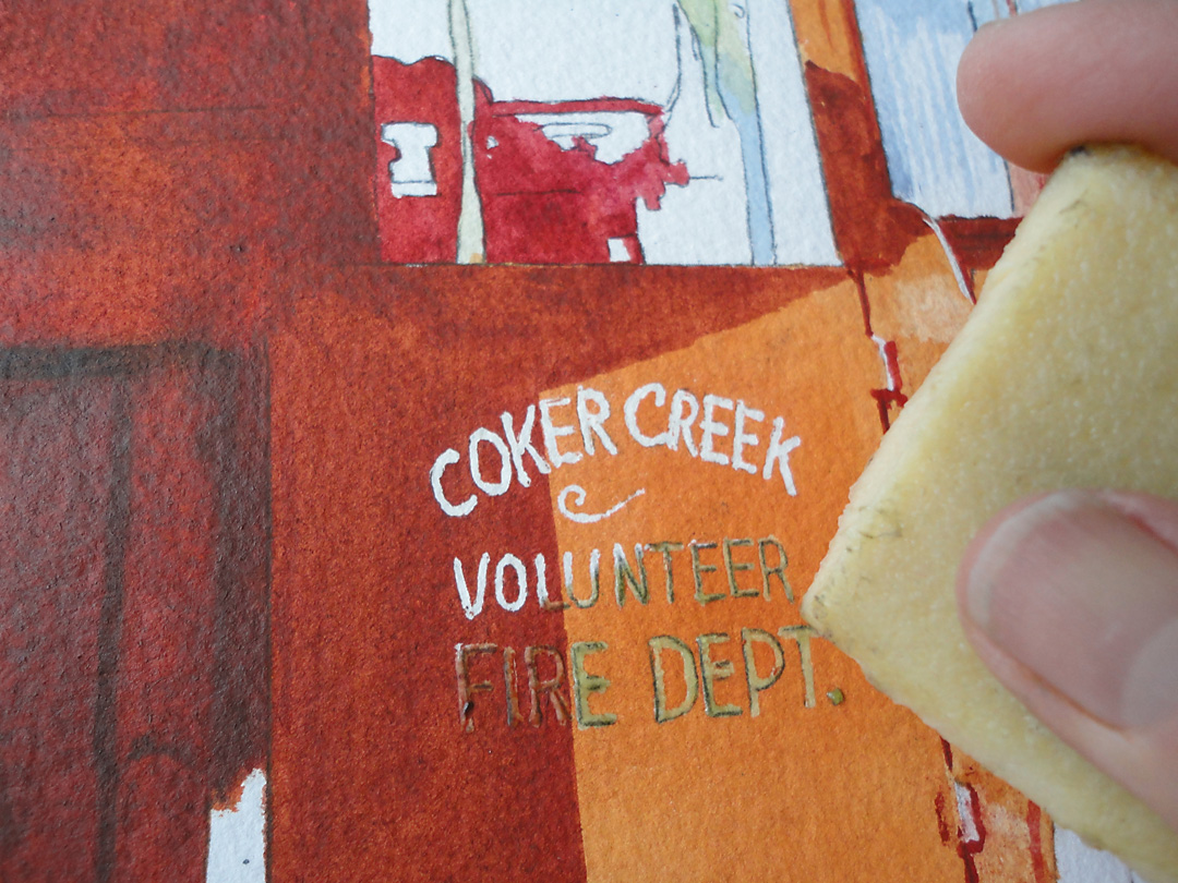 My inspiration for this painting began with the old fire truck, retired from service from the nearby mountain community of Coker Creek. I loved the hand-lettering on the door, the streaks on the windows, the age on the body, and the worn tires. The truck is currently parked on pavement, next to an empty commercial building, with a “for sale” sign on the bumper. I struggled with getting good reference photos, because the truck is parked on the north side of the building, so it only gets a bit of sunlight in early morning. Summer lighting might put it less in shadow, but I didn’t want to wait, so I took photos when the sun lit the truck best. To help me see the truck details in the shadows, I took some additional photos on another day when it was overcast, putting the entire truck in consistent light.